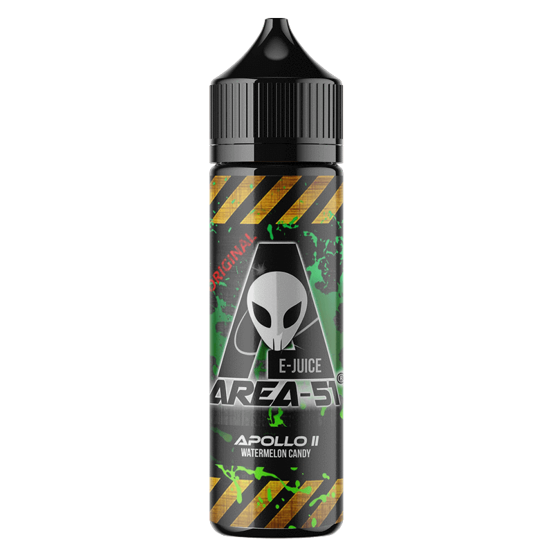 50ML, 50VG/50PG, 0MG,Apollo II By Area 51 - The Area51 Aliens have been hard at work, bringing you their newest inventions. Endoulge in the juicy and crunchy flavour of watermelon. Feel the juice explode in your mouth with an out of this world candy kiss to top it off.